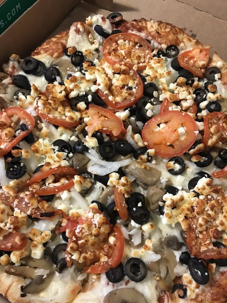 Mushrooms, black olives, onions, sliced tomatoes, our original sauce & signature three cheeses, plus feta